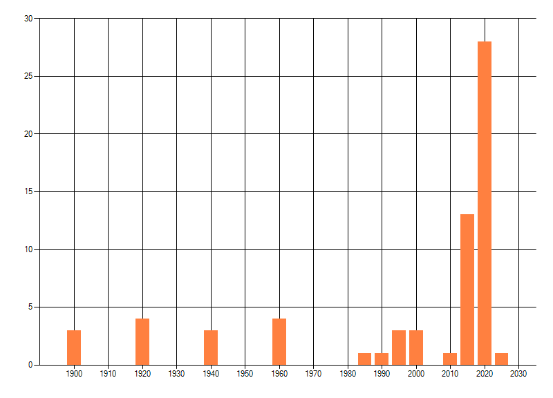 Het aantal atlasblokken (5x5 km) waarin de soort is gemeld binnen een periode van vijf jaar (vanaf 1980) of twintig jaar. Niet gecorrigeerd voor waarnemersinspanning en het aantal doorgegeven waarnemingen kan sterk variëren per periode, dus een trend in verspreiding kan hier niet direct uit worden afgelezen. Het opgegeven jaartal is het eerste jaar van de periode. Bron: gevalideerde waarnemingen uit de NDFF.