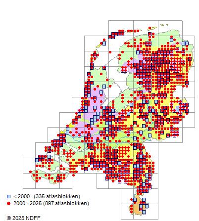 Het aantal atlasblokken (5x5 km) waarin de soort is gemeld binnen een periode van vijf jaar (vanaf 1980) of twintig jaar. Niet gecorrigeerd voor waarnemersinspanning en het aantal doorgegeven waarnemingen kan sterk variëren per periode, dus een trend in verspreiding kan hier niet direct uit worden afgelezen. Het opgegeven jaartal is het eerste jaar van de periode. Bron: gevalideerde waarnemingen uit de NDFF.