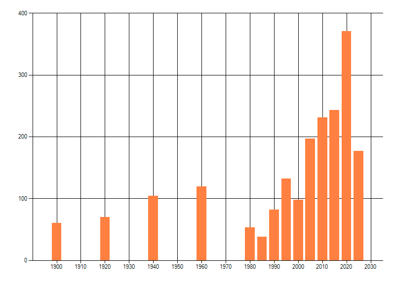 Het aantal atlasblokken (5x5 km) waarin de soort is gemeld binnen een periode van vijf jaar (vanaf 1980) of twintig jaar. Niet gecorrigeerd voor waarnemersinspanning en het aantal doorgegeven waarnemingen kan sterk variëren per periode, dus een trend in verspreiding kan hier niet direct uit worden afgelezen. Het opgegeven jaartal is het eerste jaar van de periode. Bron: gevalideerde waarnemingen uit de NDFF.