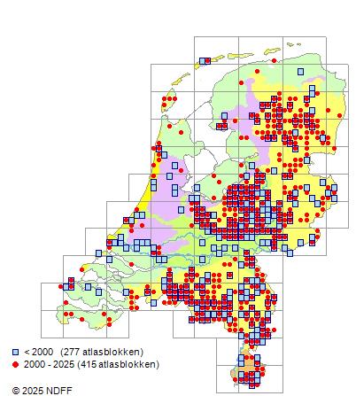 Het aantal atlasblokken (5x5 km) waarin de soort is gemeld binnen een periode van vijf jaar (vanaf 1980) of twintig jaar. Niet gecorrigeerd voor waarnemersinspanning en het aantal doorgegeven waarnemingen kan sterk variëren per periode, dus een trend in verspreiding kan hier niet direct uit worden afgelezen. Het opgegeven jaartal is het eerste jaar van de periode. Bron: gevalideerde waarnemingen uit de NDFF.