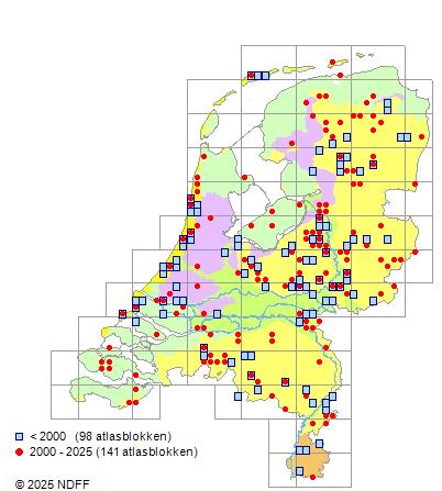 Het aantal atlasblokken (5x5 km) waarin de soort is gemeld binnen een periode van vijf jaar (vanaf 1980) of twintig jaar. Niet gecorrigeerd voor waarnemersinspanning en het aantal doorgegeven waarnemingen kan sterk variëren per periode, dus een trend in verspreiding kan hier niet direct uit worden afgelezen. Het opgegeven jaartal is het eerste jaar van de periode. Bron: gevalideerde waarnemingen uit de NDFF.