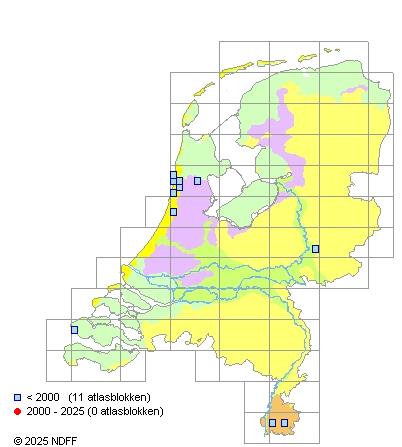 Zeer zeldzaam. De soort is alleen bekend uit de duinen van Noord-Holland. De laatste waarneming dateert uit 1995.