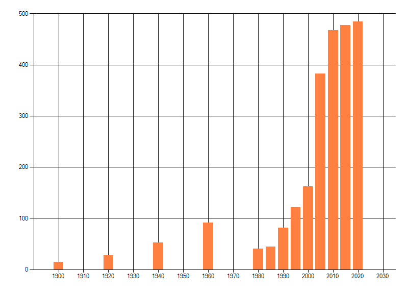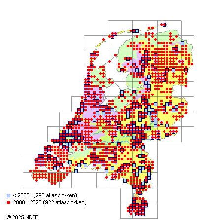 Het aantal atlasblokken (5x5 km) waarin de soort is gemeld binnen een periode van vijf jaar (vanaf 1980) of twintig jaar. Niet gecorrigeerd voor waarnemersinspanning en het aantal doorgegeven waarnemingen kan sterk variëren per periode, dus een trend in verspreiding kan hier niet direct uit worden afgelezen. Het opgegeven jaartal is het eerste jaar van de periode. Bron: gevalideerde waarnemingen uit de NDFF.