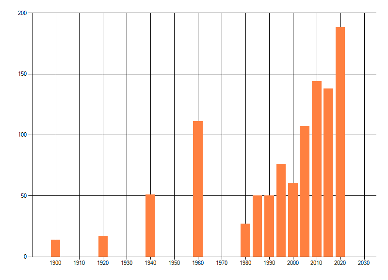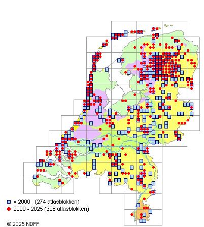 Het aantal atlasblokken (5x5 km) waarin de soort is gemeld binnen een periode van vijf jaar (vanaf 1980) of twintig jaar. Niet gecorrigeerd voor waarnemersinspanning en het aantal doorgegeven waarnemingen kan sterk variëren per periode, dus een trend in verspreiding kan hier niet direct uit worden afgelezen. Het opgegeven jaartal is het eerste jaar van de periode. Bron: gevalideerde waarnemingen uit de NDFF.