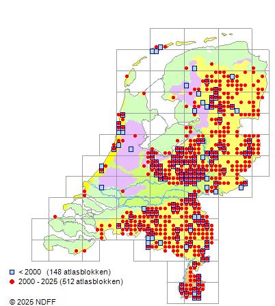 Het aantal atlasblokken (5x5 km) waarin de soort is gemeld binnen een periode van vijf jaar (vanaf 1980) of twintig jaar. Niet gecorrigeerd voor waarnemersinspanning en het aantal doorgegeven waarnemingen kan sterk variëren per periode, dus een trend in verspreiding kan hier niet direct uit worden afgelezen. Het opgegeven jaartal is het eerste jaar van de periode. Bron: gevalideerde waarnemingen uit de NDFF.