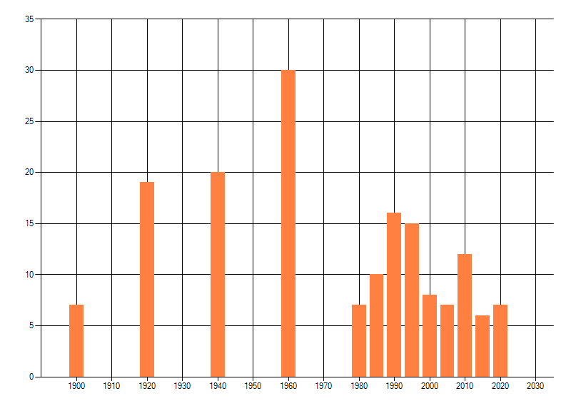 Het aantal atlasblokken (5x5 km) waarin de soort is gemeld binnen een periode van vijf jaar (vanaf 1980) of twintig jaar. Niet gecorrigeerd voor waarnemersinspanning en het aantal doorgegeven waarnemingen kan sterk variëren per periode, dus een trend in verspreiding kan hier niet direct uit worden afgelezen. Het opgegeven jaartal is het eerste jaar van de periode. Bron: gevalideerde waarnemingen uit de NDFF.
