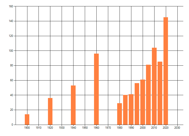 Het aantal atlasblokken (5x5 km) waarin de soort is gemeld binnen een periode van vijf jaar (vanaf 1980) of twintig jaar. Niet gecorrigeerd voor waarnemersinspanning en het aantal doorgegeven waarnemingen kan sterk variëren per periode, dus een trend in verspreiding kan hier niet direct uit worden afgelezen. Het opgegeven jaartal is het eerste jaar van de periode. Bron: gevalideerde waarnemingen uit de NDFF.