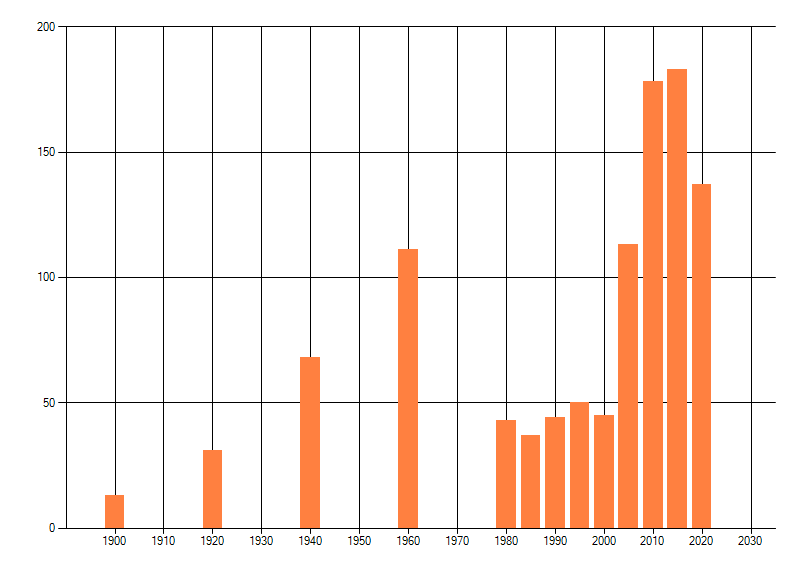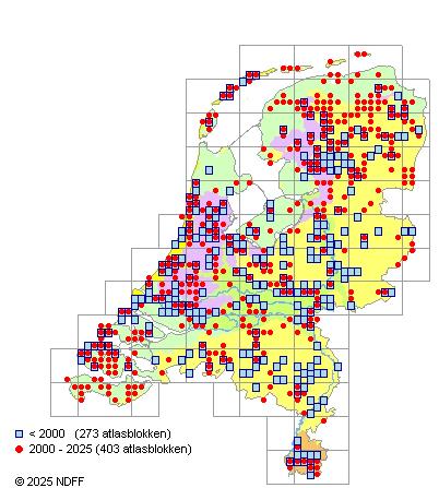 Het aantal atlasblokken (5x5 km) waarin de soort is gemeld binnen een periode van vijf jaar (vanaf 1980) of twintig jaar. Niet gecorrigeerd voor waarnemersinspanning en het aantal doorgegeven waarnemingen kan sterk variëren per periode, dus een trend in verspreiding kan hier niet direct uit worden afgelezen. Het opgegeven jaartal is het eerste jaar van de periode. Bron: gevalideerde waarnemingen uit de NDFF.