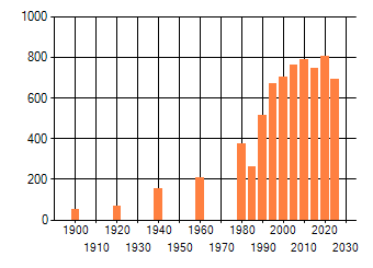 Het aantal atlasblokken (5x5 km) waarin de soort is gemeld binnen een periode van vijf jaar (vanaf 1980) of twintig jaar. Niet gecorrigeerd voor waarnemersinspanning en het aantal doorgegeven waarnemingen kan sterk variëren per periode, dus een trend in verspreiding kan hier niet direct uit worden afgelezen. Het opgegeven jaartal is het eerste jaar van de periode. Bron: gevalideerde waarnemingen uit de NDFF.