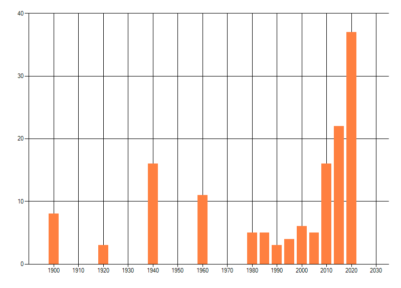 Het aantal atlasblokken (5x5 km) waarin de soort is gemeld binnen een periode van vijf jaar (vanaf 1980) of twintig jaar. Niet gecorrigeerd voor waarnemersinspanning en het aantal doorgegeven waarnemingen kan sterk variëren per periode, dus een trend in verspreiding kan hier niet direct uit worden afgelezen. Het opgegeven jaartal is het eerste jaar van de periode. Bron: gevalideerde waarnemingen uit de NDFF.
