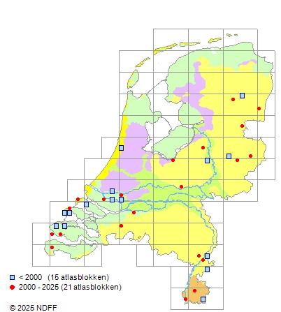 Het aantal atlasblokken (5x5 km) waarin de soort is gemeld binnen een periode van vijf jaar (vanaf 1980) of twintig jaar. Niet gecorrigeerd voor waarnemersinspanning en het aantal doorgegeven waarnemingen kan sterk variëren per periode, dus een trend in verspreiding kan hier niet direct uit worden afgelezen. Het opgegeven jaartal is het eerste jaar van de periode. Bron: gevalideerde waarnemingen uit de NDFF.