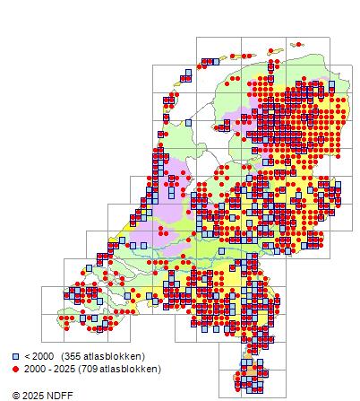 Het aantal atlasblokken (5x5 km) waarin de soort is gemeld binnen een periode van vijf jaar (vanaf 1980) of twintig jaar. Niet gecorrigeerd voor waarnemersinspanning en het aantal doorgegeven waarnemingen kan sterk variëren per periode, dus een trend in verspreiding kan hier niet direct uit worden afgelezen. Het opgegeven jaartal is het eerste jaar van de periode. Bron: gevalideerde waarnemingen uit de NDFF.
