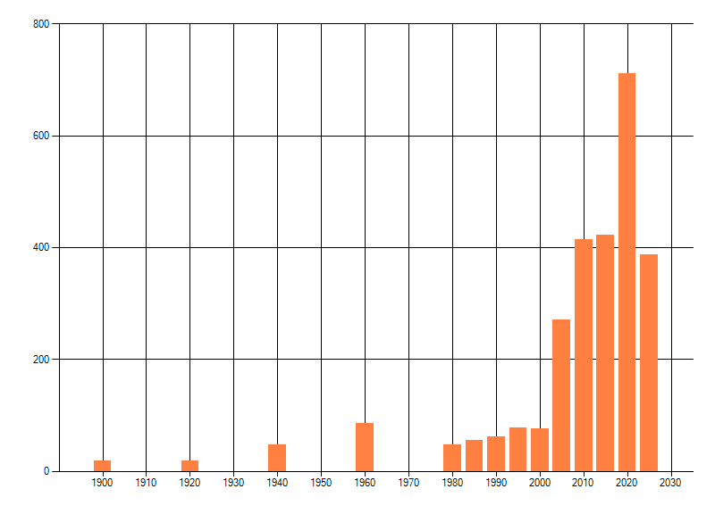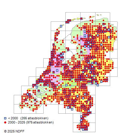 Het aantal atlasblokken (5x5 km) waarin de soort is gemeld binnen een periode van vijf jaar (vanaf 1980) of twintig jaar. Niet gecorrigeerd voor waarnemersinspanning en het aantal doorgegeven waarnemingen kan sterk variëren per periode, dus een trend in verspreiding kan hier niet direct uit worden afgelezen. Het opgegeven jaartal is het eerste jaar van de periode. Bron: gevalideerde waarnemingen uit de NDFF.