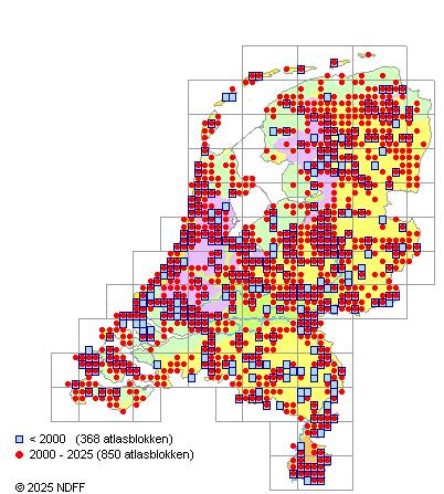 Het aantal atlasblokken (5x5 km) waarin de soort is gemeld binnen een periode van vijf jaar (vanaf 1980) of twintig jaar. Niet gecorrigeerd voor waarnemersinspanning en het aantal doorgegeven waarnemingen kan sterk variëren per periode, dus een trend in verspreiding kan hier niet direct uit worden afgelezen. Het opgegeven jaartal is het eerste jaar van de periode. Bron: gevalideerde waarnemingen uit de NDFF.