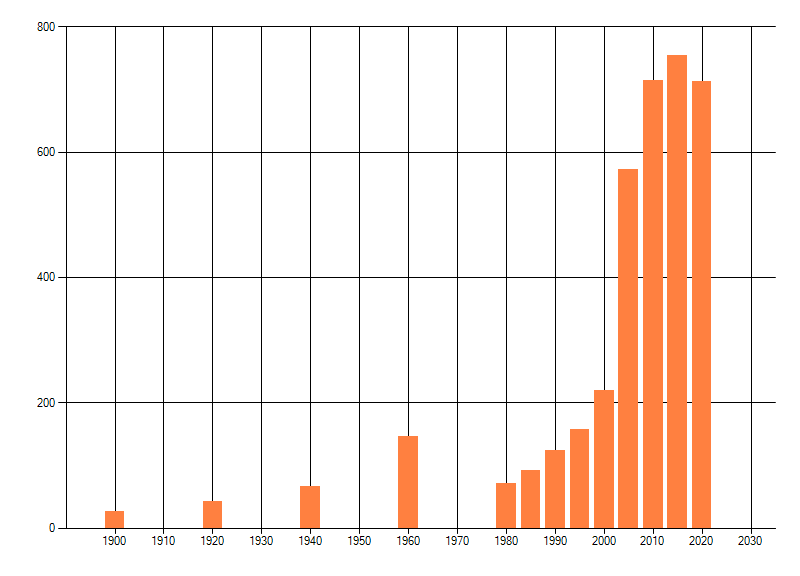 Het aantal atlasblokken (5x5 km) waarin de soort is gemeld binnen een periode van vijf jaar (vanaf 1980) of twintig jaar. Niet gecorrigeerd voor waarnemersinspanning en het aantal doorgegeven waarnemingen kan sterk variëren per periode, dus een trend in verspreiding kan hier niet direct uit worden afgelezen. Het opgegeven jaartal is het eerste jaar van de periode. Bron: gevalideerde waarnemingen uit de NDFF.