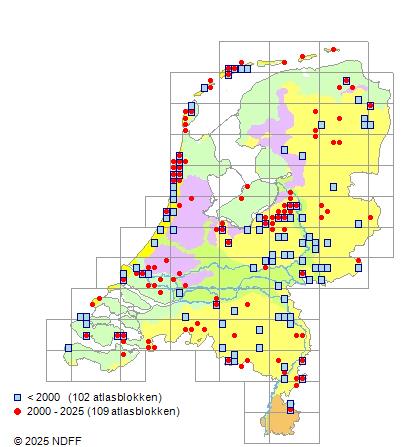 Het aantal atlasblokken (5x5 km) waarin de soort is gemeld binnen een periode van vijf jaar (vanaf 1980) of twintig jaar. Niet gecorrigeerd voor waarnemersinspanning en het aantal doorgegeven waarnemingen kan sterk variëren per periode, dus een trend in verspreiding kan hier niet direct uit worden afgelezen. Het opgegeven jaartal is het eerste jaar van de periode. Bron: gevalideerde waarnemingen uit de NDFF.