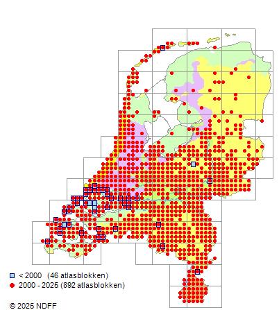 Vrij algemeen. Komt vooral in de zuidwesthoek van het land, langs de kust en in Limburg voor. RL: niet bedreigd.
