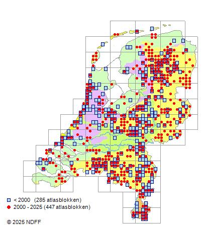 Het aantal atlasblokken (5x5 km) waarin de soort is gemeld binnen een periode van vijf jaar (vanaf 1980) of twintig jaar. Niet gecorrigeerd voor waarnemersinspanning en het aantal doorgegeven waarnemingen kan sterk variëren per periode, dus een trend in verspreiding kan hier niet direct uit worden afgelezen. Het opgegeven jaartal is het eerste jaar van de periode. Bron: gevalideerde waarnemingen uit de NDFF.
