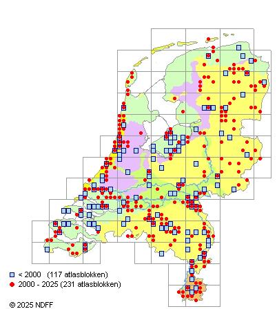 Het aantal atlasblokken (5x5 km) waarin de soort is gemeld binnen een periode van vijf jaar (vanaf 1980) of twintig jaar. Niet gecorrigeerd voor waarnemersinspanning en het aantal doorgegeven waarnemingen kan sterk variëren per periode, dus een trend in verspreiding kan hier niet direct uit worden afgelezen. Het opgegeven jaartal is het eerste jaar van de periode. Bron: gevalideerde waarnemingen uit de NDFF.
