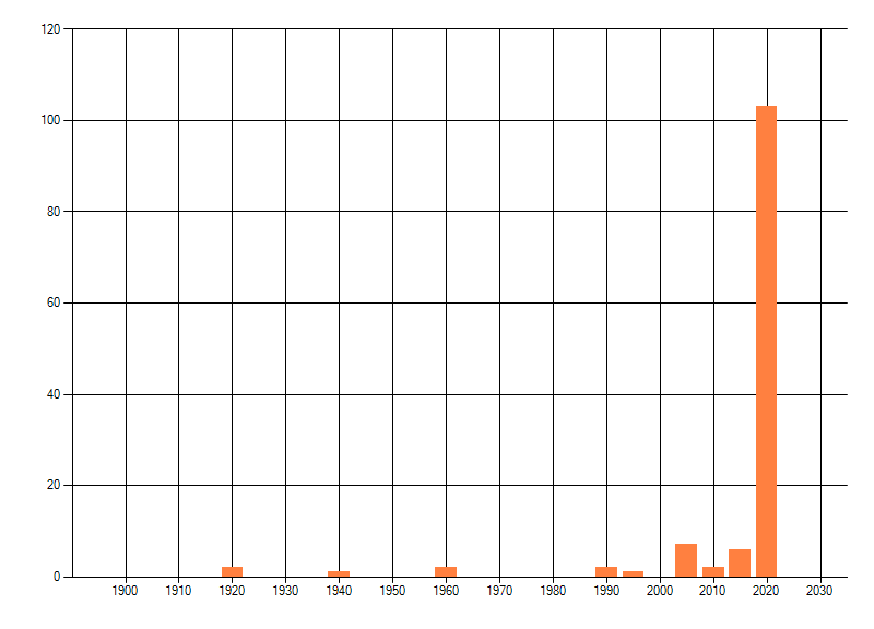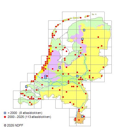 Het aantal atlasblokken (5x5 km) waarin de soort is gemeld binnen een periode van vijf jaar (vanaf 1980) of twintig jaar. Niet gecorrigeerd voor waarnemersinspanning en het aantal doorgegeven waarnemingen kan sterk variëren per periode, dus een trend in verspreiding kan hier niet direct uit worden afgelezen. Het opgegeven jaartal is het eerste jaar van de periode. Bron: gevalideerde waarnemingen uit de NDFF.
