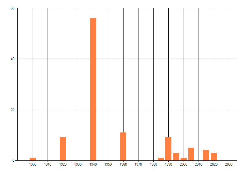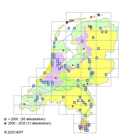 Het aantal atlasblokken (5x5 km) waarin de soort is gemeld binnen een periode van vijf jaar (vanaf 1980) of twintig jaar. Niet gecorrigeerd voor waarnemersinspanning en het aantal doorgegeven waarnemingen kan sterk variëren per periode, dus een trend in verspreiding kan hier niet direct uit worden afgelezen. Het opgegeven jaartal is het eerste jaar van de periode. Bron: gevalideerde waarnemingen uit de NDFF.