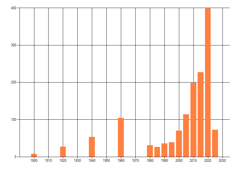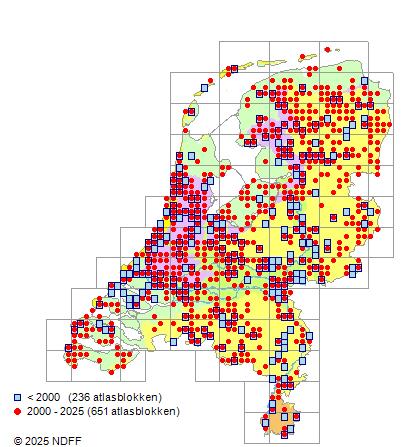 Het aantal atlasblokken (5x5 km) waarin de soort is gemeld binnen een periode van vijf jaar (vanaf 1980) of twintig jaar. Niet gecorrigeerd voor waarnemersinspanning en het aantal doorgegeven waarnemingen kan sterk variëren per periode, dus een trend in verspreiding kan hier niet direct uit worden afgelezen. Het opgegeven jaartal is het eerste jaar van de periode. Bron: gevalideerde waarnemingen uit de NDFF.