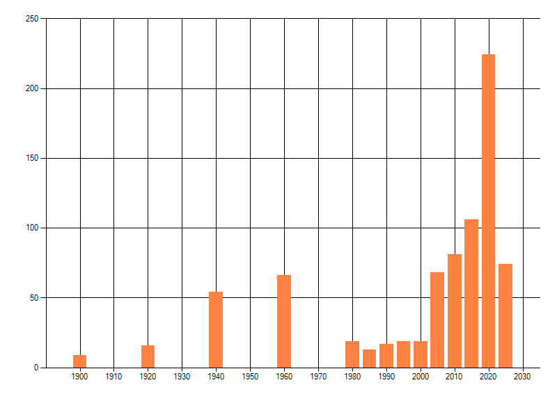 Het aantal atlasblokken (5x5 km) waarin de soort is gemeld binnen een periode van vijf jaar (vanaf 1980) of twintig jaar. Niet gecorrigeerd voor waarnemersinspanning en het aantal doorgegeven waarnemingen kan sterk variëren per periode, dus een trend in verspreiding kan hier niet direct uit worden afgelezen. Het opgegeven jaartal is het eerste jaar van de periode. Bron: gevalideerde waarnemingen uit de NDFF.