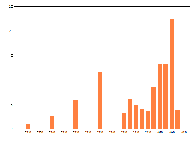 Het aantal atlasblokken (5x5 km) waarin de soort is gemeld binnen een periode van vijf jaar (vanaf 1980) of twintig jaar. Niet gecorrigeerd voor waarnemersinspanning en het aantal doorgegeven waarnemingen kan sterk variëren per periode, dus een trend in verspreiding kan hier niet direct uit worden afgelezen. Het opgegeven jaartal is het eerste jaar van de periode. Bron: gevalideerde waarnemingen uit de NDFF.