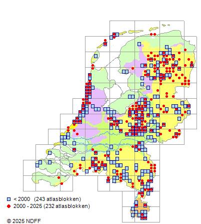 Het aantal atlasblokken (5x5 km) waarin de soort is gemeld binnen een periode van vijf jaar (vanaf 1980) of twintig jaar. Niet gecorrigeerd voor waarnemersinspanning en het aantal doorgegeven waarnemingen kan sterk variëren per periode, dus een trend in verspreiding kan hier niet direct uit worden afgelezen. Het opgegeven jaartal is het eerste jaar van de periode. Bron: gevalideerde waarnemingen uit de NDFF.