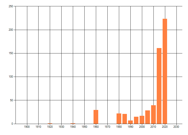 Het aantal atlasblokken (5x5 km) waarin de soort is gemeld binnen een periode van vijf jaar (vanaf 1980) of twintig jaar. Niet gecorrigeerd voor waarnemersinspanning en het aantal doorgegeven waarnemingen kan sterk variëren per periode, dus een trend in verspreiding kan hier niet direct uit worden afgelezen. Het opgegeven jaartal is het eerste jaar van de periode. Bron: gevalideerde waarnemingen uit de NDFF.