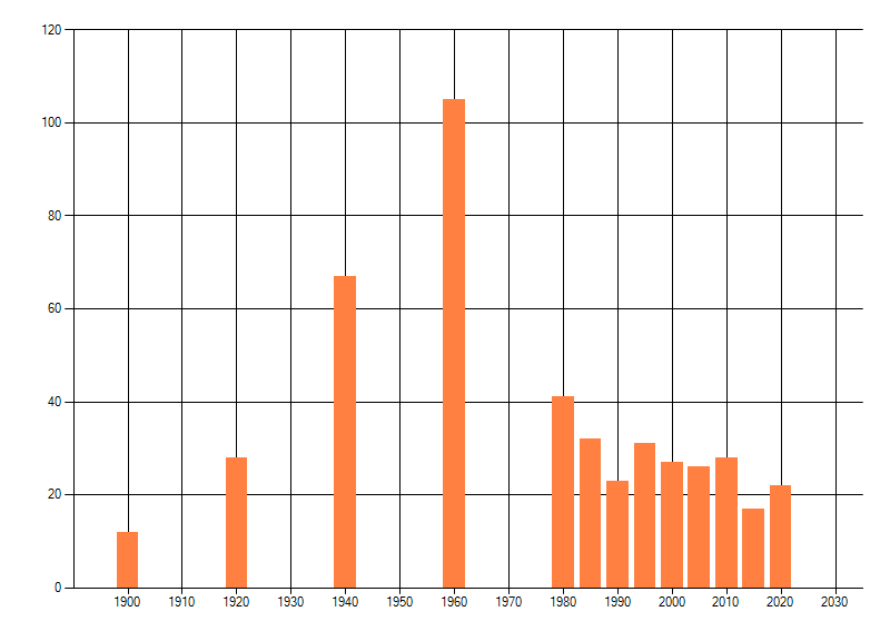 Het aantal atlasblokken (5x5 km) waarin de soort is gemeld binnen een periode van vijf jaar (vanaf 1980) of twintig jaar. Niet gecorrigeerd voor waarnemersinspanning en het aantal doorgegeven waarnemingen kan sterk variëren per periode, dus een trend in verspreiding kan hier niet direct uit worden afgelezen. Het opgegeven jaartal is het eerste jaar van de periode. Bron: gevalideerde waarnemingen uit de NDFF.