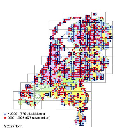 Het aantal atlasblokken (5x5 km) waarin de soort is gemeld binnen een periode van vijf jaar (vanaf 1980) of twintig jaar. Niet gecorrigeerd voor waarnemersinspanning en het aantal doorgegeven waarnemingen kan sterk variëren per periode, dus een trend in verspreiding kan hier niet direct uit worden afgelezen. Het opgegeven jaartal is het eerste jaar van de periode. Bron: gevalideerde waarnemingen uit de NDFF.