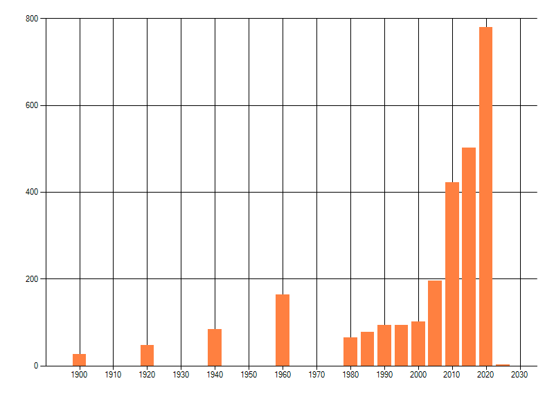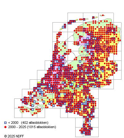Het aantal atlasblokken (5x5 km) waarin de soort is gemeld binnen een periode van vijf jaar (vanaf 1980) of twintig jaar. Niet gecorrigeerd voor waarnemersinspanning en het aantal doorgegeven waarnemingen kan sterk variëren per periode, dus een trend in verspreiding kan hier niet direct uit worden afgelezen. Het opgegeven jaartal is het eerste jaar van de periode. Bron: gevalideerde waarnemingen uit de NDFF.
