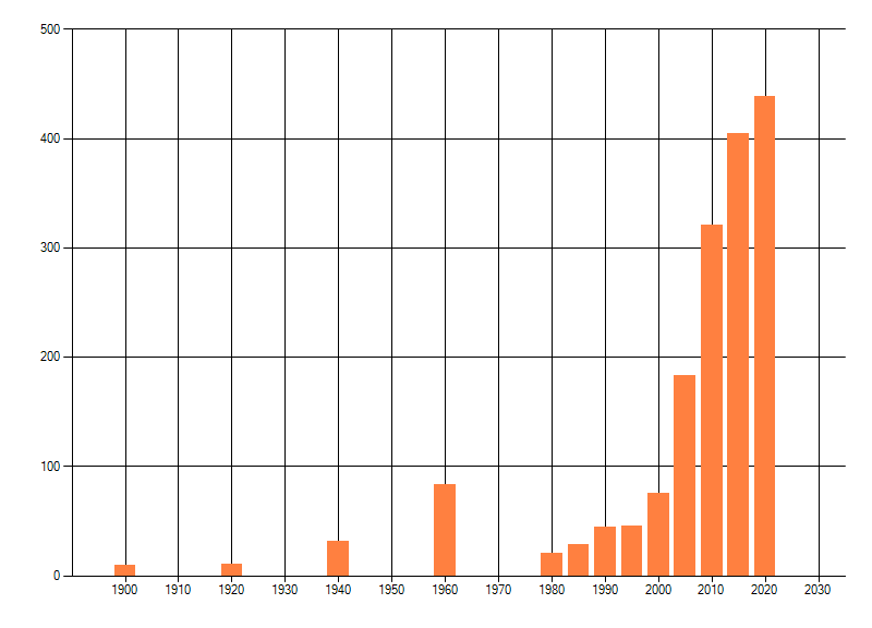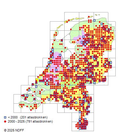 Het aantal atlasblokken (5x5 km) waarin de soort is gemeld binnen een periode van vijf jaar (vanaf 1980) of twintig jaar. Niet gecorrigeerd voor waarnemersinspanning en het aantal doorgegeven waarnemingen kan sterk variëren per periode, dus een trend in verspreiding kan hier niet direct uit worden afgelezen. Het opgegeven jaartal is het eerste jaar van de periode. Bron: gevalideerde waarnemingen uit de NDFF.