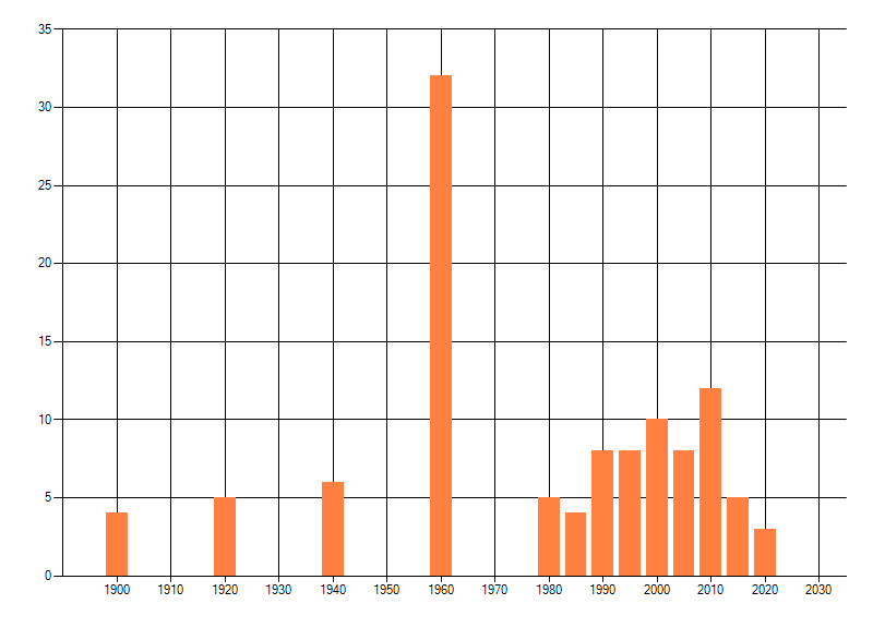 Het aantal atlasblokken (5x5 km) waarin de soort is gemeld binnen een periode van vijf jaar (vanaf 1980) of twintig jaar. Niet gecorrigeerd voor waarnemersinspanning en het aantal doorgegeven waarnemingen kan sterk variëren per periode, dus een trend in verspreiding kan hier niet direct uit worden afgelezen. Het opgegeven jaartal is het eerste jaar van de periode. Bron: gevalideerde waarnemingen uit de NDFF.
