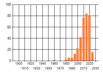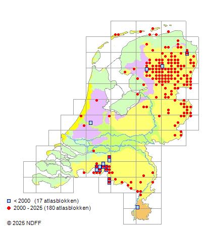 Het aantal atlasblokken (5x5 km) waarin de soort is gemeld binnen een periode van vijf jaar (vanaf 1980) of twintig jaar. Niet gecorrigeerd voor waarnemersinspanning en het aantal doorgegeven waarnemingen kan sterk variëren per periode, dus een trend in verspreiding kan hier niet direct uit worden afgelezen. Het opgegeven jaartal is het eerste jaar van de periode. Bron: gevalideerde waarnemingen uit de NDFF.