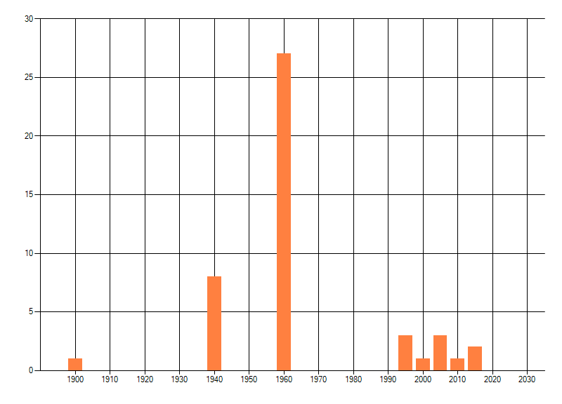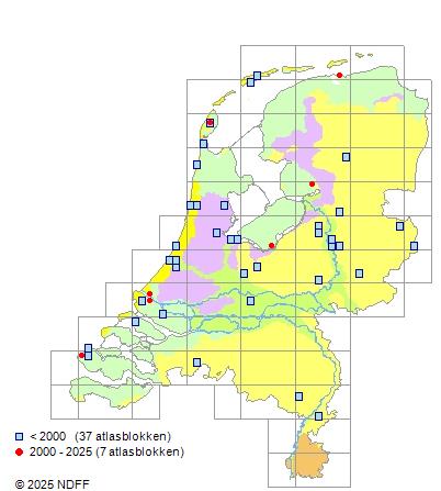 Het aantal atlasblokken (5x5 km) waarin de soort is gemeld binnen een periode van vijf jaar (vanaf 1980) of twintig jaar. Niet gecorrigeerd voor waarnemersinspanning en het aantal doorgegeven waarnemingen kan sterk variëren per periode, dus een trend in verspreiding kan hier niet direct uit worden afgelezen. Het opgegeven jaartal is het eerste jaar van de periode. Bron: gevalideerde waarnemingen uit de NDFF.