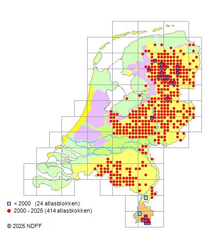 Het aantal atlasblokken (5x5 km) waarin de soort is gemeld binnen een periode van vijf jaar (vanaf 1980) of twintig jaar. Niet gecorrigeerd voor waarnemersinspanning en het aantal doorgegeven waarnemingen kan sterk variëren per periode, dus een trend in verspreiding kan hier niet direct uit worden afgelezen. Het opgegeven jaartal is het eerste jaar van de periode. Bron: gevalideerde waarnemingen uit de NDFF.
