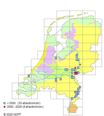 Zeer zeldzaam. Slechts enkele waarnemingen zijn bekend; de meeste waarnemingen komen uit Gelderland. RL: ernstig bedreigd.
