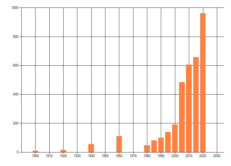 Het aantal atlasblokken (5x5 km) waarin de soort is gemeld binnen een periode van vijf jaar (vanaf 1980) of twintig jaar. Niet gecorrigeerd voor waarnemersinspanning en het aantal doorgegeven waarnemingen kan sterk variëren per periode, dus een trend in verspreiding kan hier niet direct uit worden afgelezen. Het opgegeven jaartal is het eerste jaar van de periode. Bron: gevalideerde waarnemingen uit de NDFF.