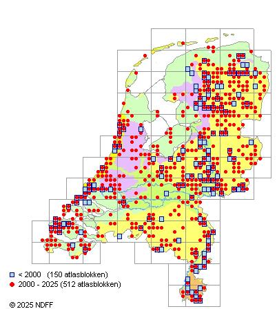 Vrij zeldzaam. Komt verspreid over het land lokaal voor; er zijn geen waarnemingen bekend van de Waddeneilanden. RL: kwetsbaar.