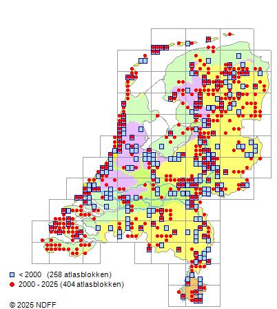 Het aantal atlasblokken (5x5 km) waarin de soort is gemeld binnen een periode van vijf jaar (vanaf 1980) of twintig jaar. Niet gecorrigeerd voor waarnemersinspanning en het aantal doorgegeven waarnemingen kan sterk variëren per periode, dus een trend in verspreiding kan hier niet direct uit worden afgelezen. Het opgegeven jaartal is het eerste jaar van de periode. Bron: gevalideerde waarnemingen uit de NDFF.