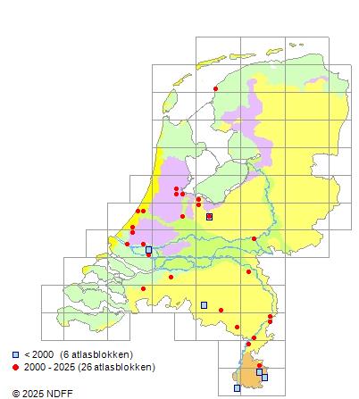 Het aantal atlasblokken (5x5 km) waarin de soort is gemeld binnen een periode van vijf jaar (vanaf 1980) of twintig jaar. Niet gecorrigeerd voor waarnemersinspanning en het aantal doorgegeven waarnemingen kan sterk variëren per periode, dus een trend in verspreiding kan hier niet direct uit worden afgelezen. Het opgegeven jaartal is het eerste jaar van de periode. Bron: gevalideerde waarnemingen uit de NDFF.