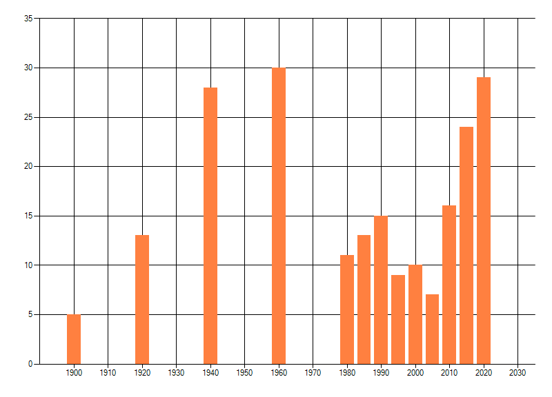 Het aantal atlasblokken (5x5 km) waarin de soort is gemeld binnen een periode van vijf jaar (vanaf 1980) of twintig jaar. Niet gecorrigeerd voor waarnemersinspanning en het aantal doorgegeven waarnemingen kan sterk variëren per periode, dus een trend in verspreiding kan hier niet direct uit worden afgelezen. Het opgegeven jaartal is het eerste jaar van de periode. Bron: gevalideerde waarnemingen uit de NDFF.
