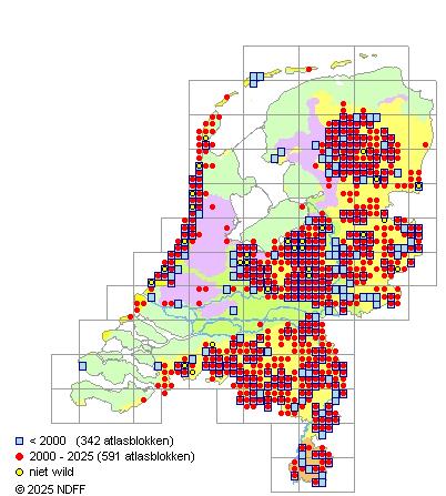 Het aantal atlasblokken (5x5 km) waarin de soort is gemeld binnen een periode van vijf jaar (vanaf 1980) of twintig jaar. Niet gecorrigeerd voor waarnemersinspanning en het aantal doorgegeven waarnemingen kan sterk variëren per periode, dus een trend in verspreiding kan hier niet direct uit worden afgelezen. Het opgegeven jaartal is het eerste jaar van de periode. Bron: gevalideerde waarnemingen uit de NDFF.