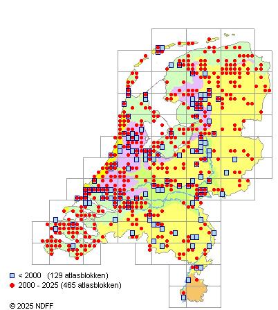 Het aantal atlasblokken (5x5 km) waarin de soort is gemeld binnen een periode van vijf jaar (vanaf 1980) of twintig jaar. Niet gecorrigeerd voor waarnemersinspanning en het aantal doorgegeven waarnemingen kan sterk variëren per periode, dus een trend in verspreiding kan hier niet direct uit worden afgelezen. Het opgegeven jaartal is het eerste jaar van de periode. Bron: gevalideerde waarnemingen uit de NDFF.