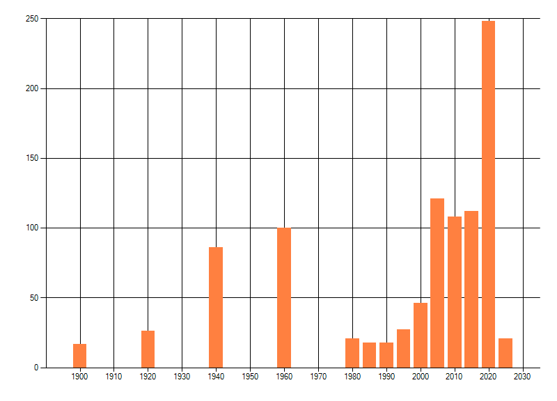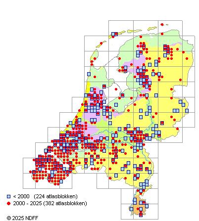 Het aantal atlasblokken (5x5 km) waarin de soort is gemeld binnen een periode van vijf jaar (vanaf 1980) of twintig jaar. Niet gecorrigeerd voor waarnemersinspanning en het aantal doorgegeven waarnemingen kan sterk variëren per periode, dus een trend in verspreiding kan hier niet direct uit worden afgelezen. Het opgegeven jaartal is het eerste jaar van de periode. Bron: gevalideerde waarnemingen uit de NDFF.