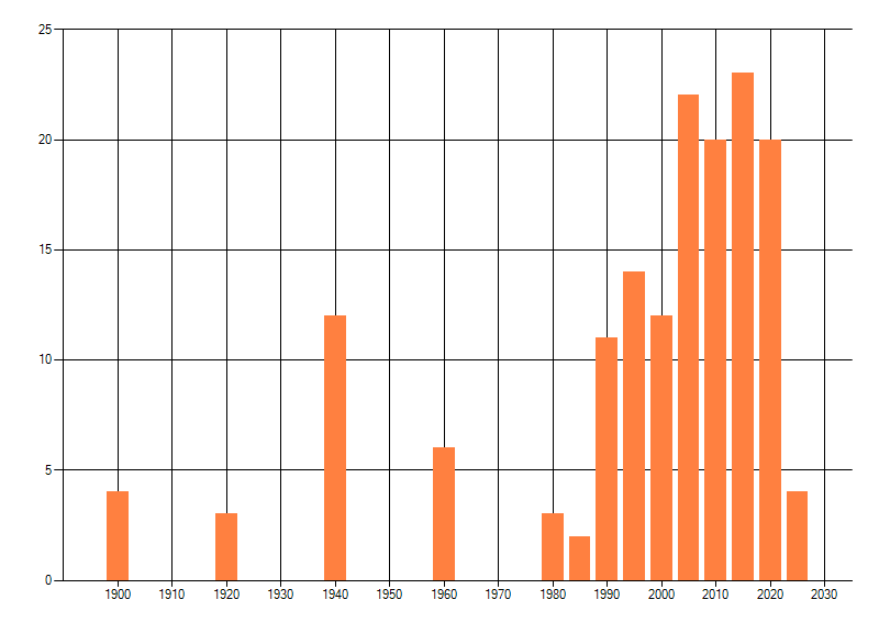 Het aantal atlasblokken (5x5 km) waarin de soort is gemeld binnen een periode van vijf jaar (vanaf 1980) of twintig jaar. Niet gecorrigeerd voor waarnemersinspanning en het aantal doorgegeven waarnemingen kan sterk variëren per periode, dus een trend in verspreiding kan hier niet direct uit worden afgelezen. Het opgegeven jaartal is het eerste jaar van de periode. Bron: gevalideerde waarnemingen uit de NDFF.