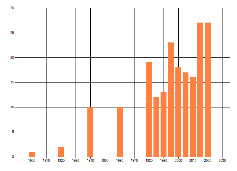 Het aantal atlasblokken (5x5 km) waarin de soort is gemeld binnen een periode van vijf jaar (vanaf 1980) of twintig jaar. Niet gecorrigeerd voor waarnemersinspanning en het aantal doorgegeven waarnemingen kan sterk variëren per periode, dus een trend in verspreiding kan hier niet direct uit worden afgelezen. Het opgegeven jaartal is het eerste jaar van de periode. Bron: gevalideerde waarnemingen uit de NDFF.