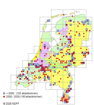 Het aantal atlasblokken (5x5 km) waarin de soort is gemeld binnen een periode van vijf jaar (vanaf 1980) of twintig jaar. Niet gecorrigeerd voor waarnemersinspanning en het aantal doorgegeven waarnemingen kan sterk variëren per periode, dus een trend in verspreiding kan hier niet direct uit worden afgelezen. Het opgegeven jaartal is het eerste jaar van de periode. Bron: gevalideerde waarnemingen uit de NDFF.